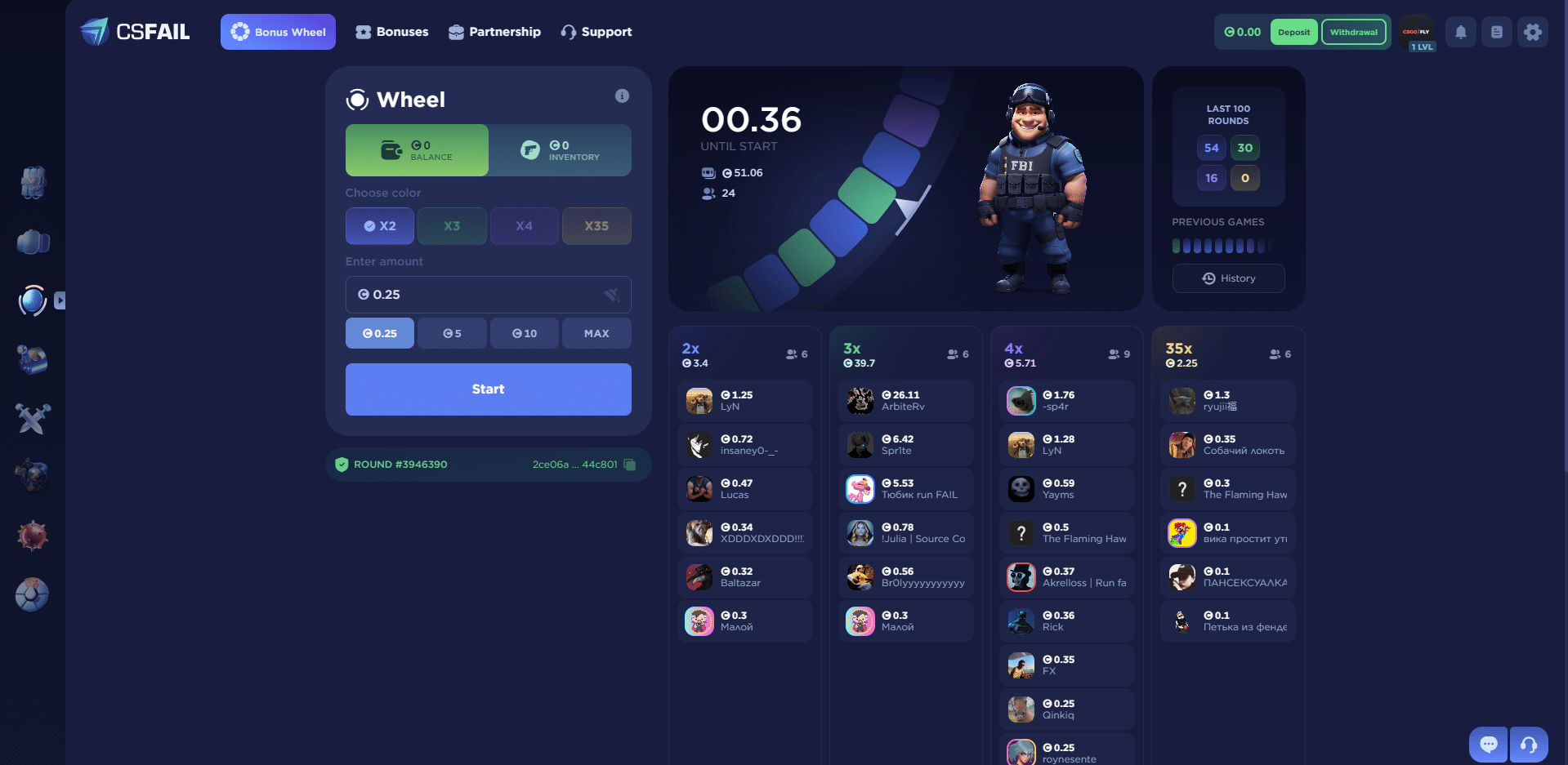 CSFail has a bonus wheel that you can spin after a set amount of time. You can earn different prizes on the wheel such as a bet refund in case of loss, N-random skins on deposits, cashbacks, secret codes, and more. You can also complete quests on the site to earn additional spins. CSFail also has a partnership program that offers different referral percentages as you level up.
