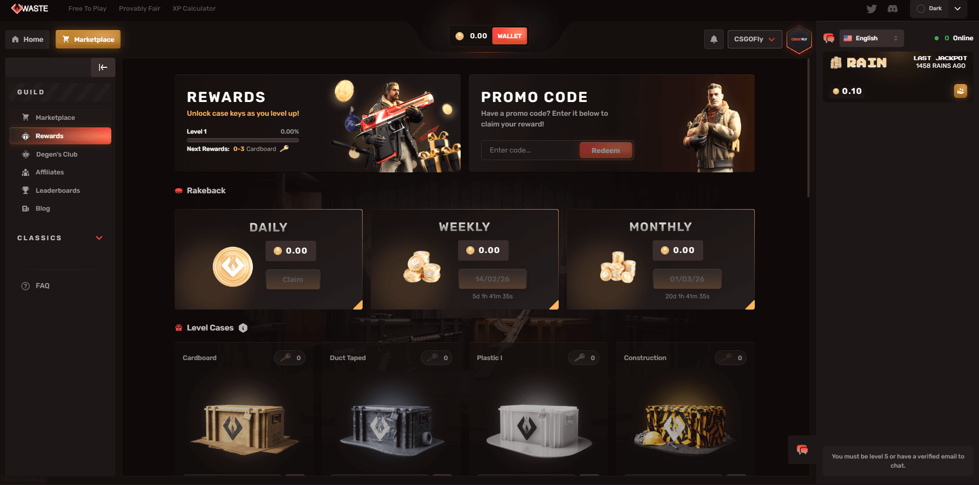 A periodic event where coins are distributed to active players. When rain starts distributing, you have a short window to join. Every rain has a 10% chance to become a jackpot, where one lucky player wins the entire jackpot pool with odds weighted by level. To participate, you must be at least Level 5, have a verified email, and have deposited in the past 7 days.